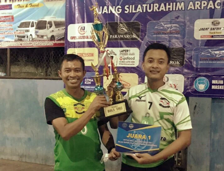 | Imam Nawawi dan Agung Wahana memegang piala Juara pertama, Turnamen Bola Voli ARPAC BEKASI CUP 2021 |